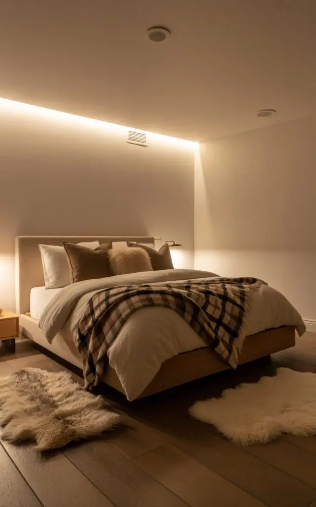 Layers of light add depth and coziness, transforming a cold basement into a dreamy retreat.