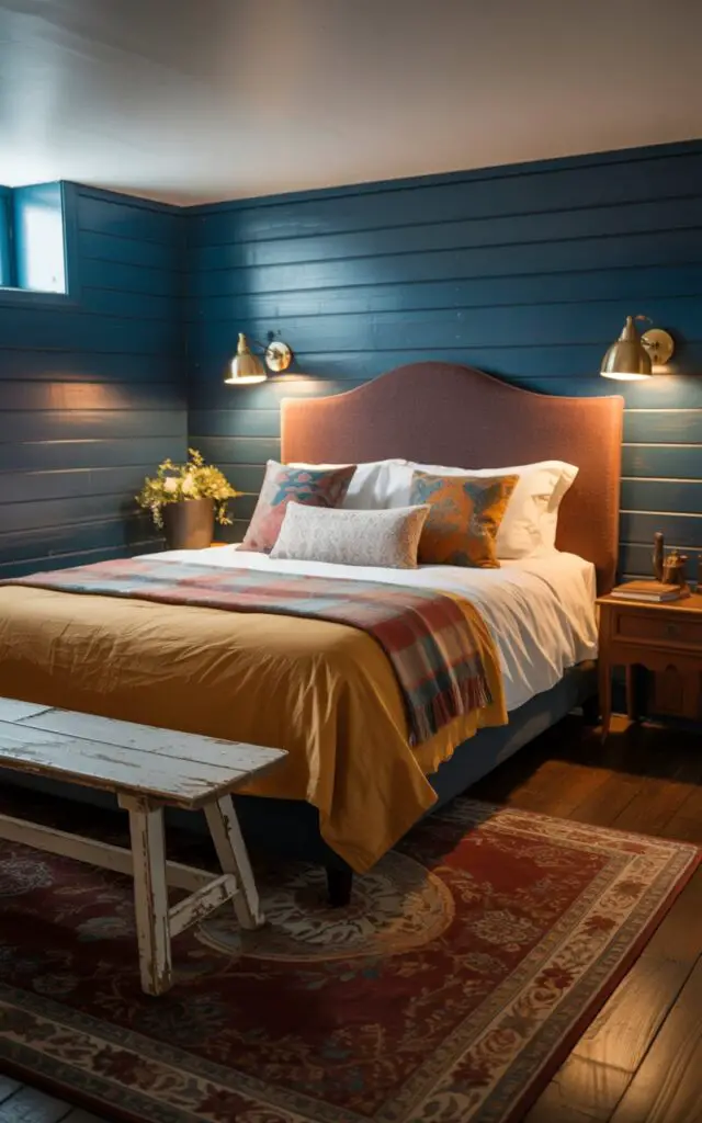Embrace the basement mood with rich, earthy shades—deep green, burnt orange, or warm charcoal.