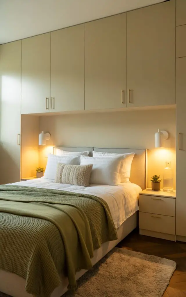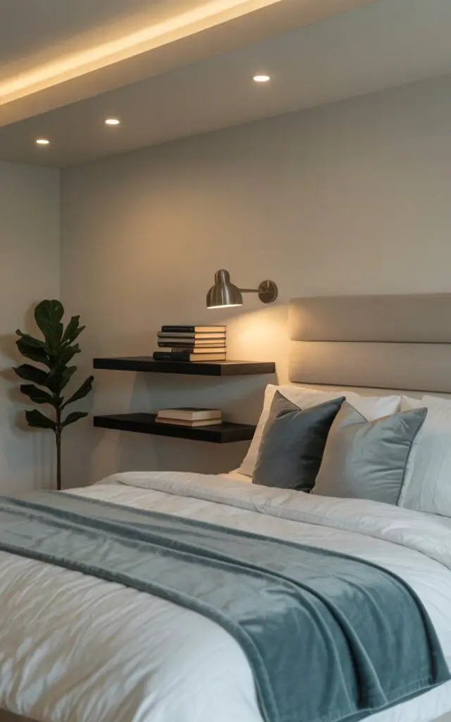 Tall bookshelves, wall-mounted cabinets, or floating nightstands free up precious floor space.