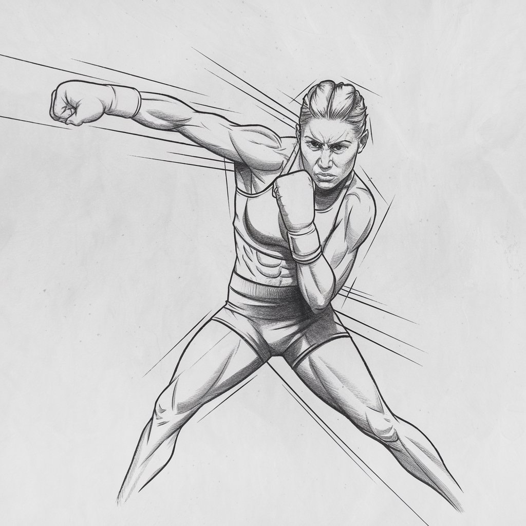 Capture a woman mid-punch, muscles tense, fists flying.