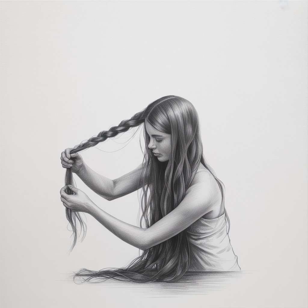 She’s twisting strands, arms lifted, maybe a bit tangled.