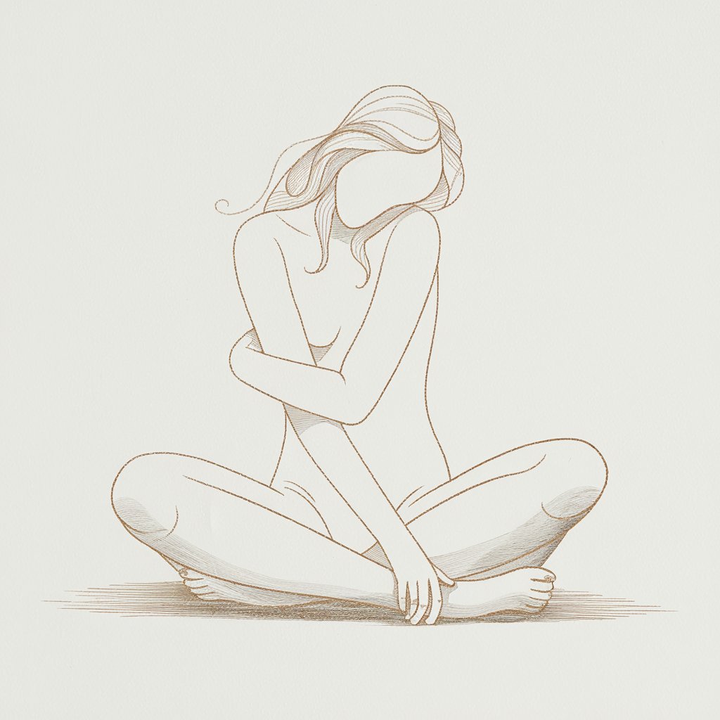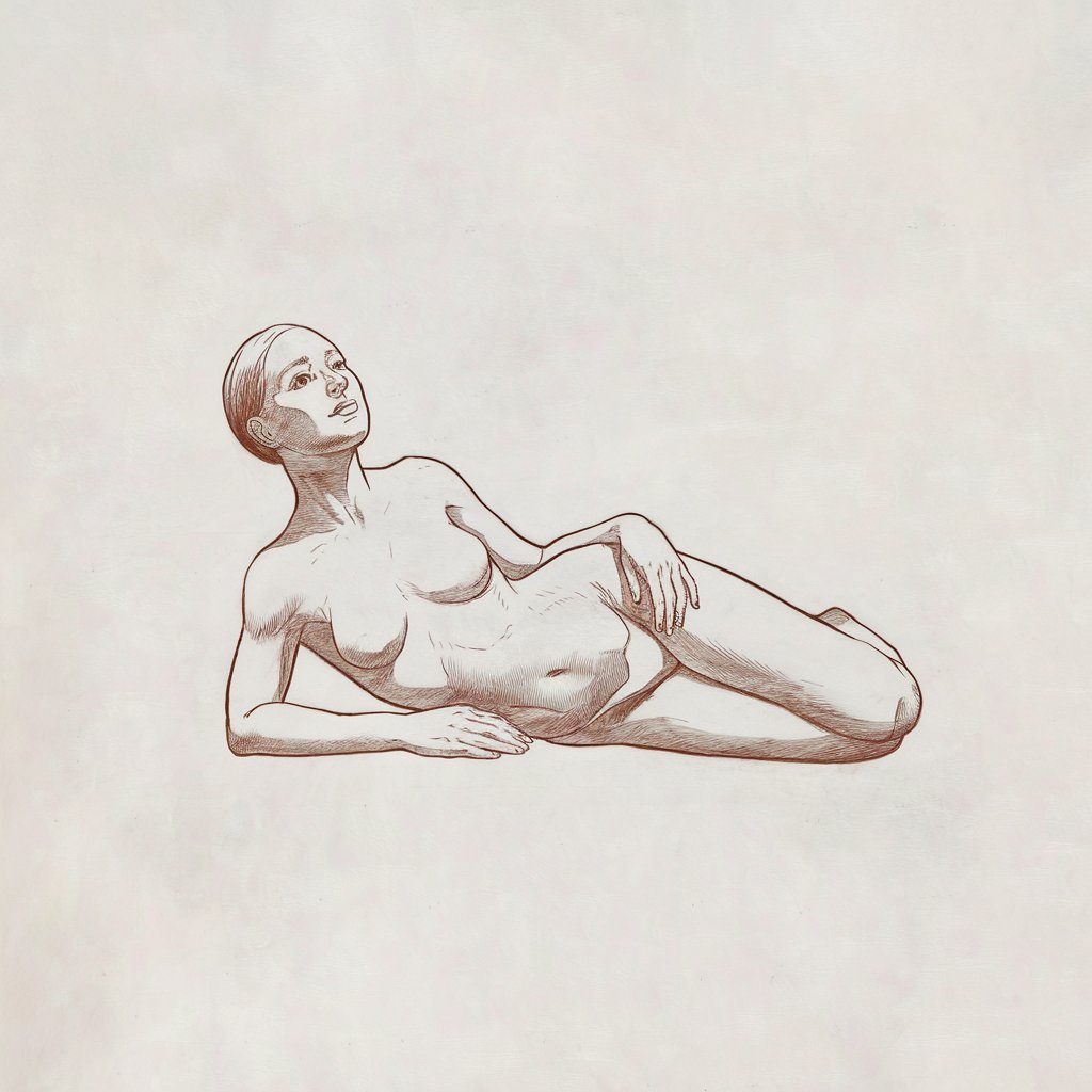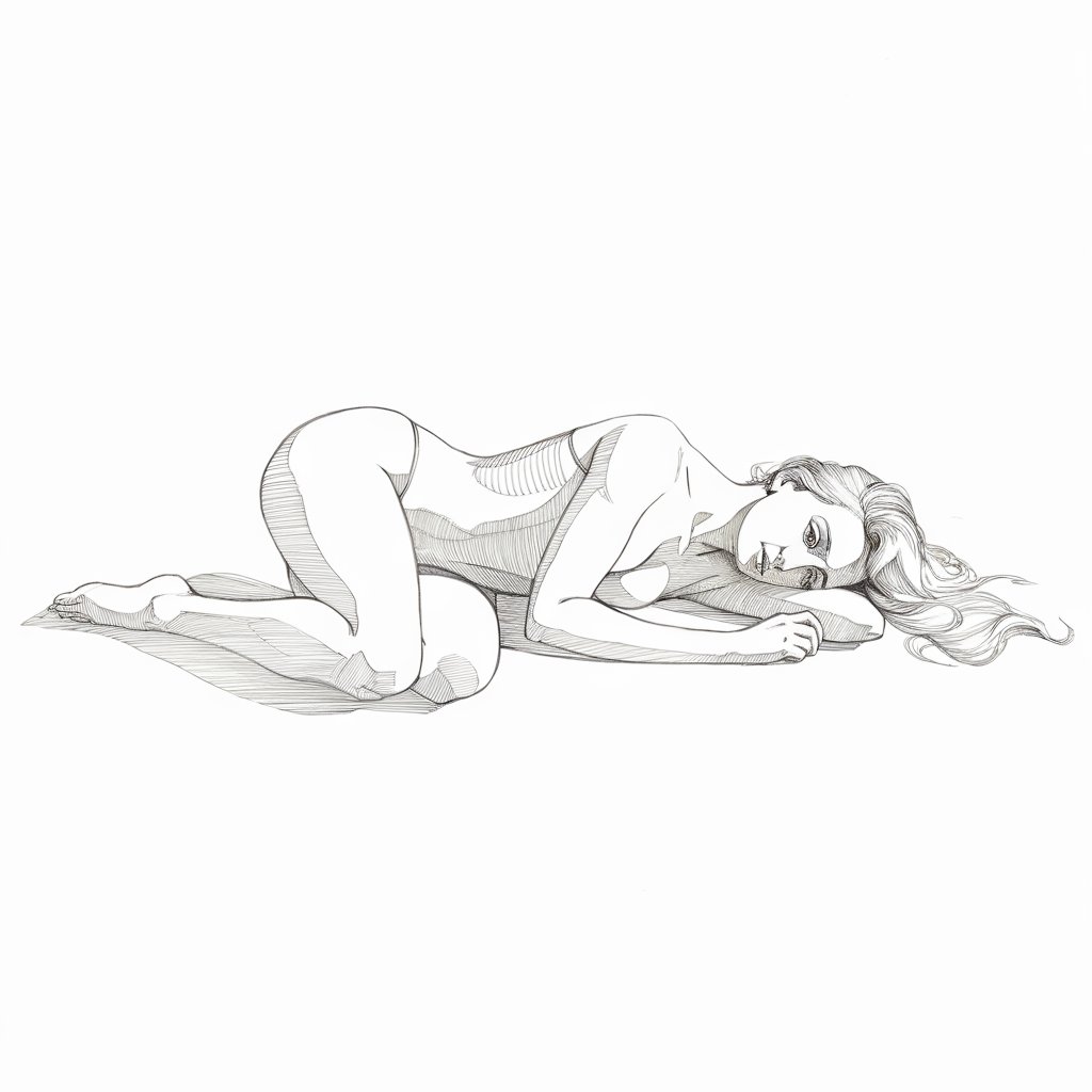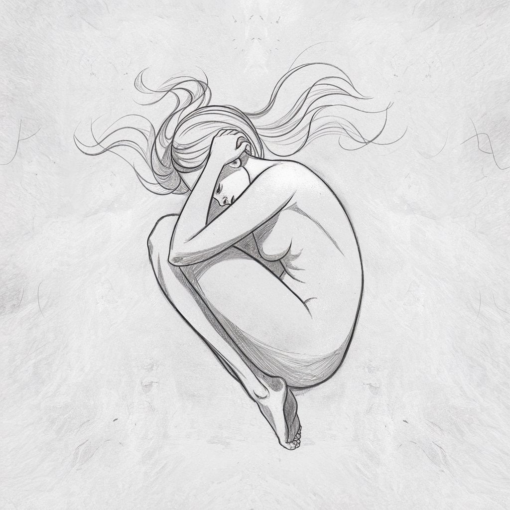 Draw a woman from above—maybe lying in grass or curled on a bed.