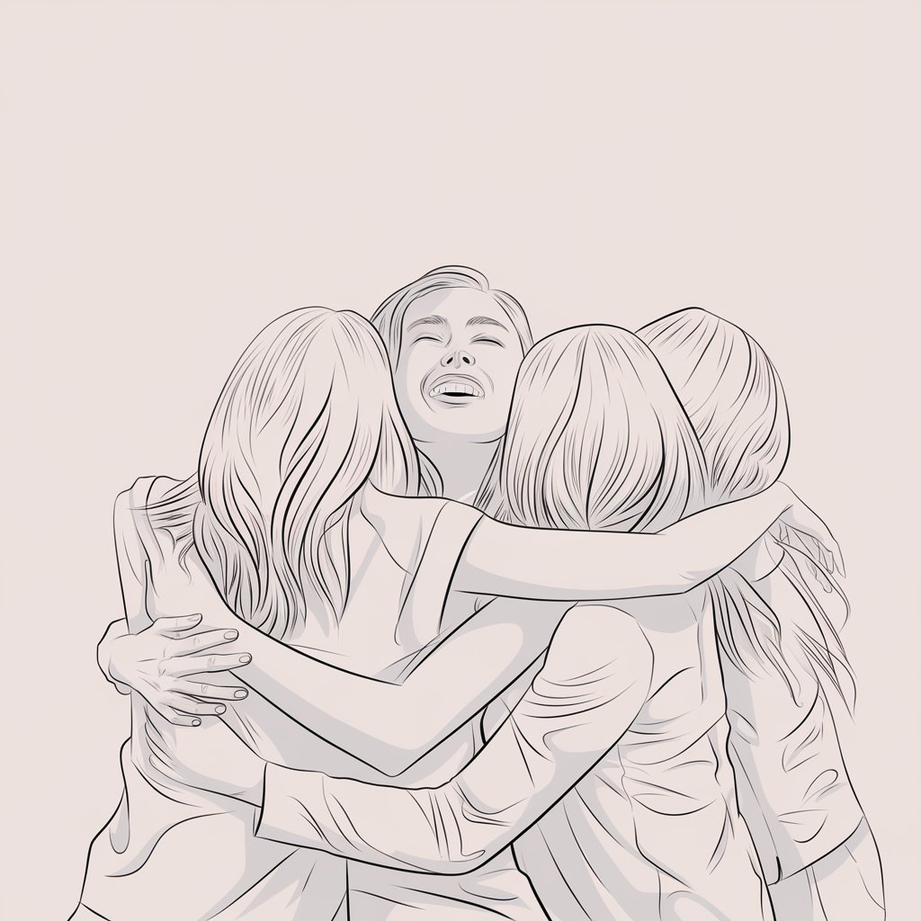 She’s laughing in a tangle of arms—genuine joy, squished cheeks, happy chaos.