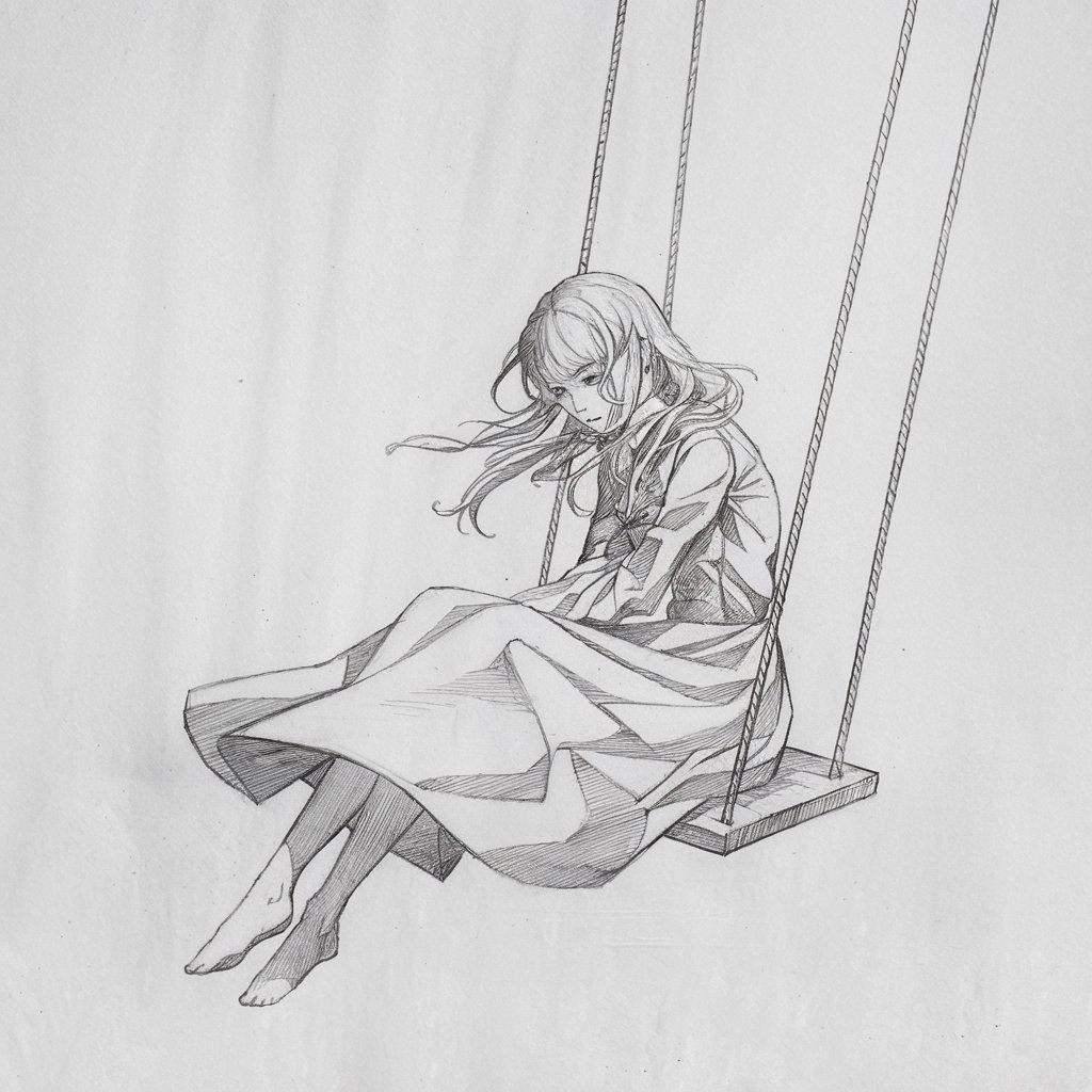 She’s sitting on a swing—still or mid-sway. Legs dangle, hair moves, maybe her toes barely touch the ground.
