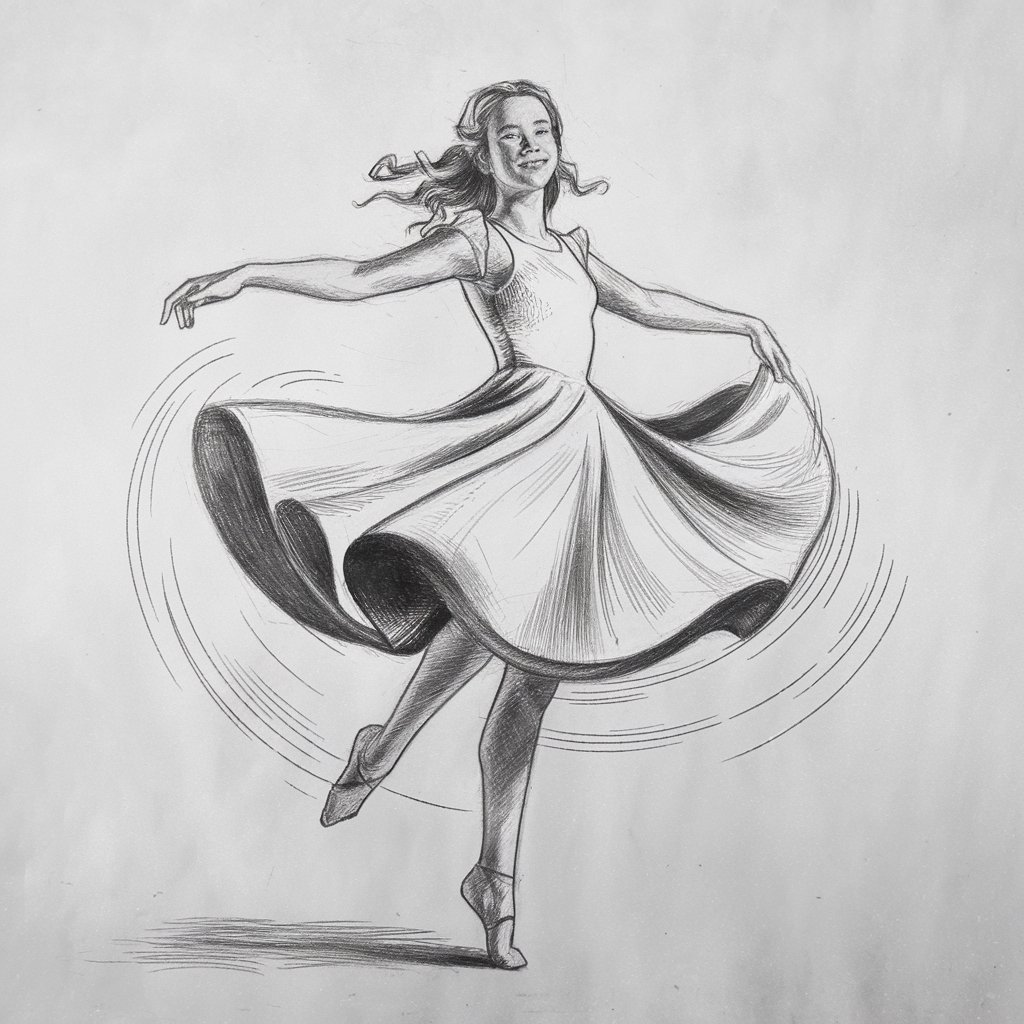 Let her be mid-spin or frozen at center stage.