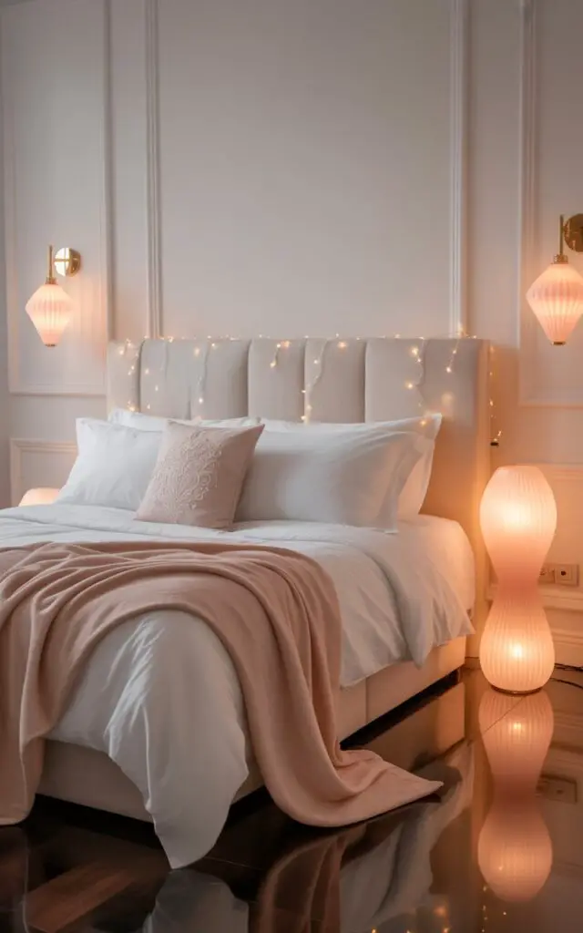 Soft pinks come alive in golden light, and suddenly, your bedroom turns into the ultimate wind-down zone.