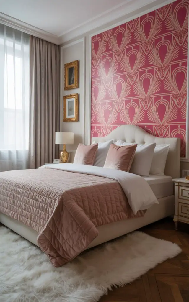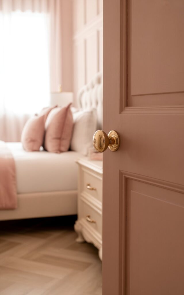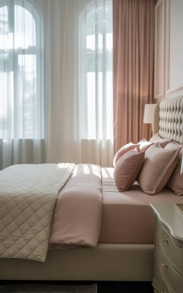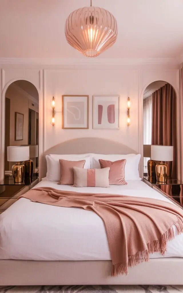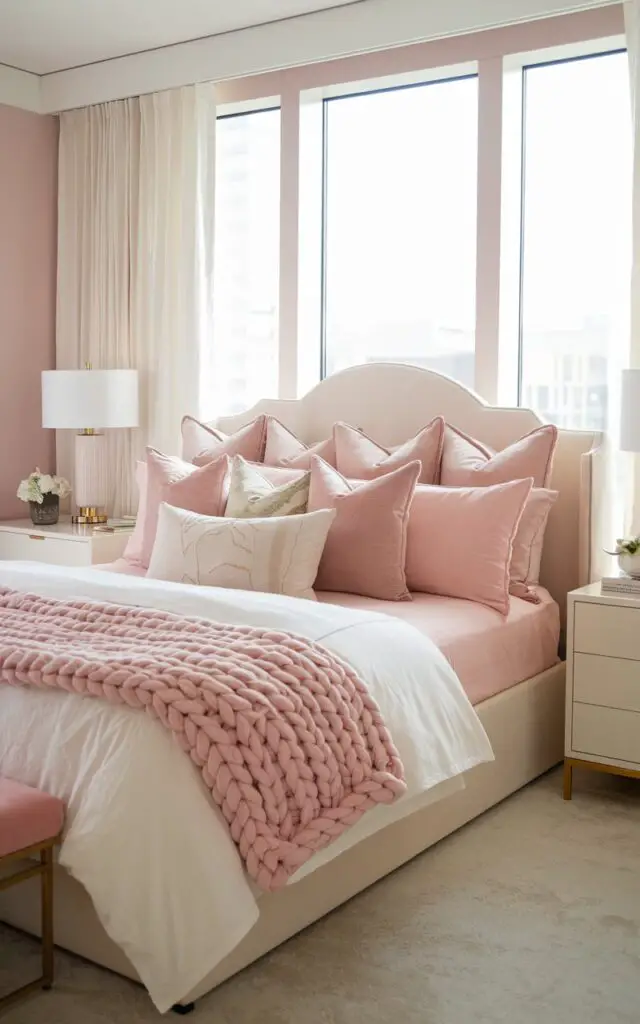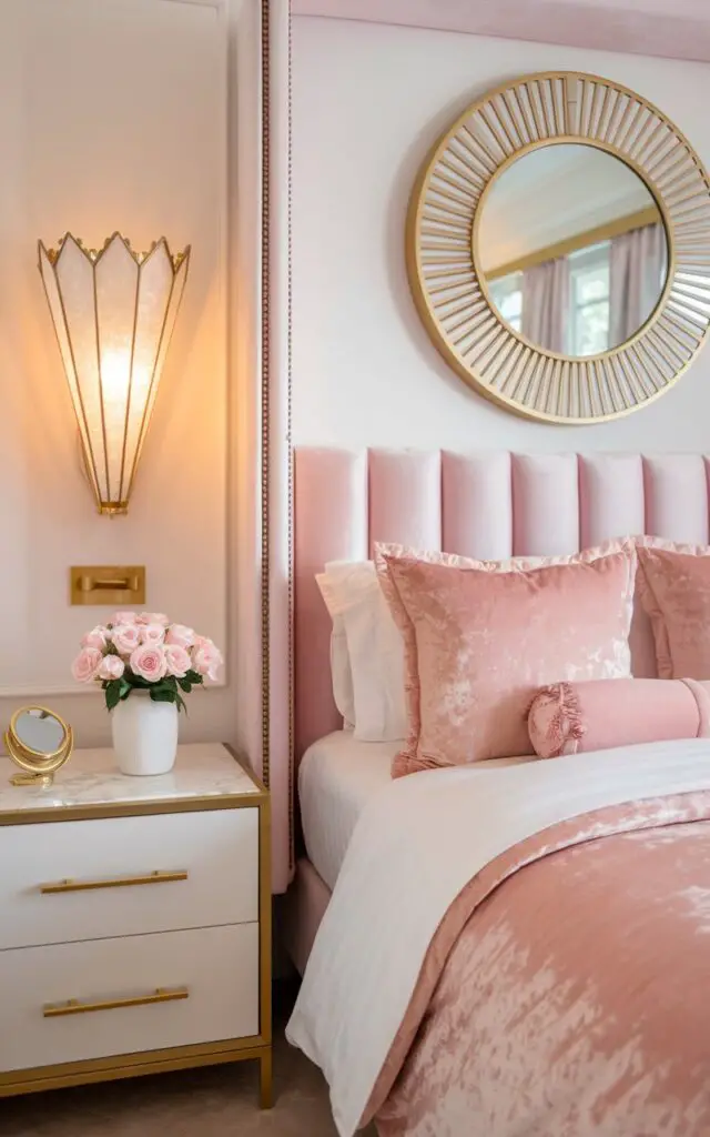 A blush velvet bench at the foot of your bed or a soft pink armchair in the corner adds elegance without trying too hard.