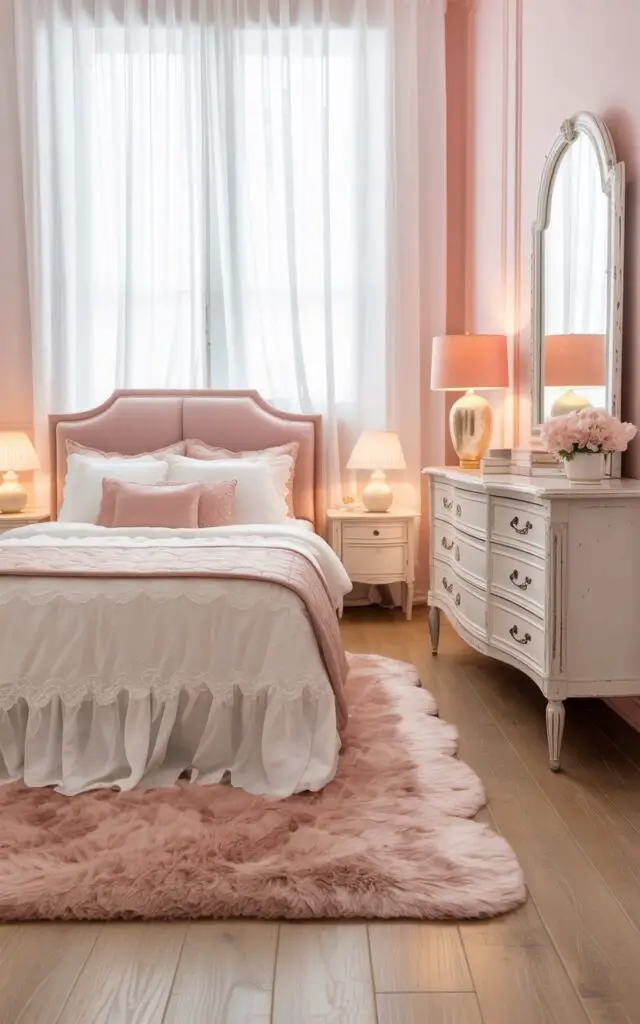 Pink pendant lights or rose-tinted lampshades cast a warm, cozy glow.