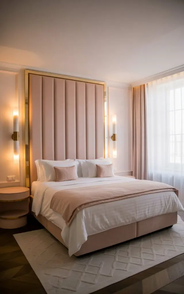 Want instant luxury? A blush pink upholstered headboard is your best friend.