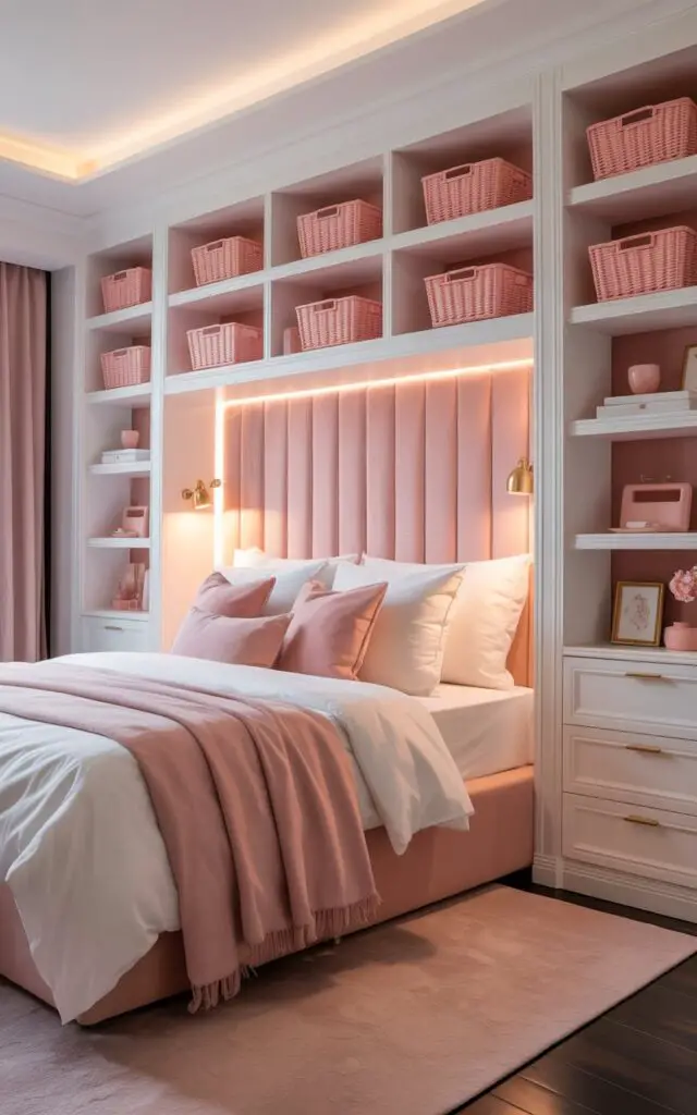 White built-in shelves or closets keep clutter out of sight while blending into your room’s soft palette.