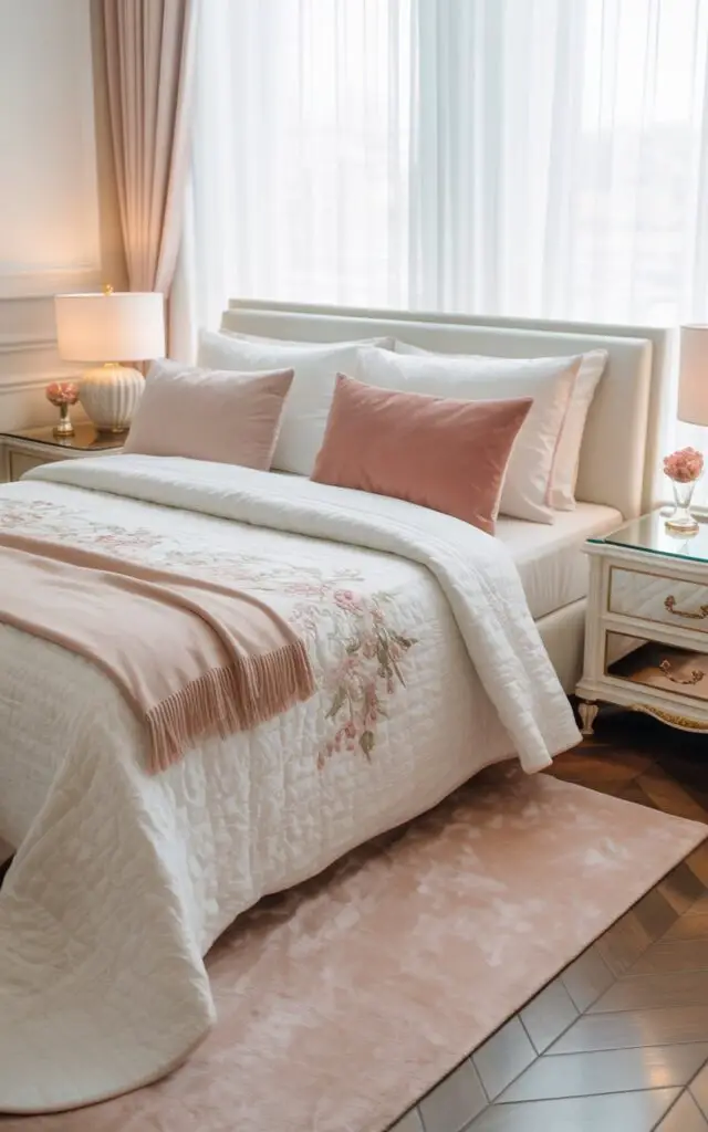 Combine blush pink sheets with creamy ivory duvets and quilted throws.