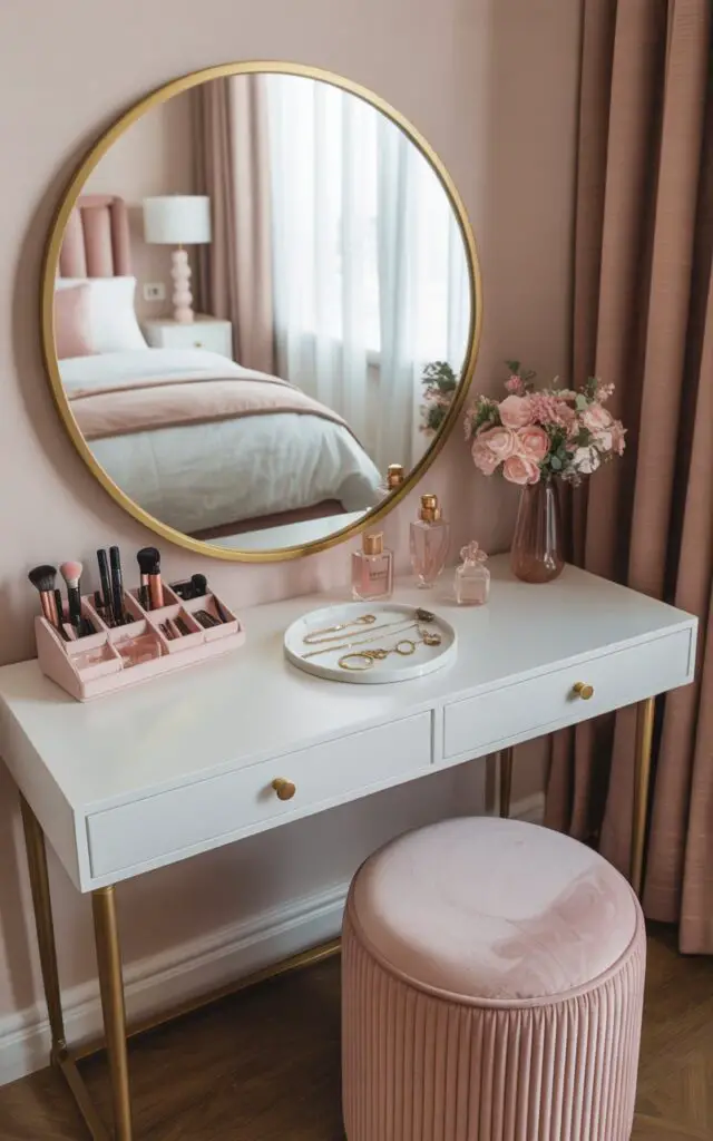 Add a tray with perfume bottles and blush-toned organizers. Getting ready becomes less of a chore and more of a treat.