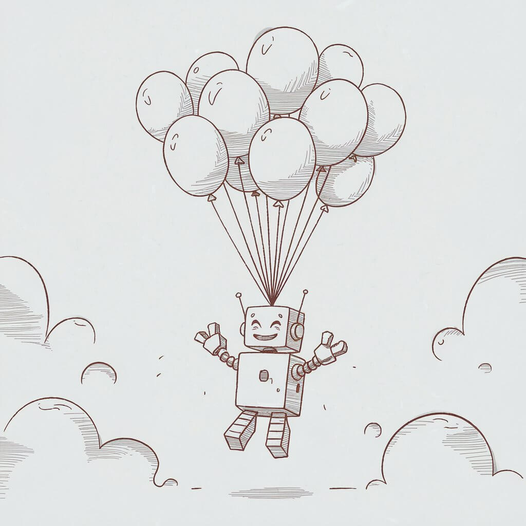 A minimalist, plain white background pencil drawing illustration of a balloon-carrying robot. The robot is in a simplistic style and floats gently, lifted by a bunch of sketchy balloons tied to its back. The robot's small, boxy body dangles beneath, legs limp and arms spread wide. Each balloon is a soft oval with a tiny highlight mark and thin string lines extending to the bot's shoulders. The robot's face shows a happy grin and closed eyes, as if enjoying the lift. The airy layout and floating elements create a playful, weightless design.