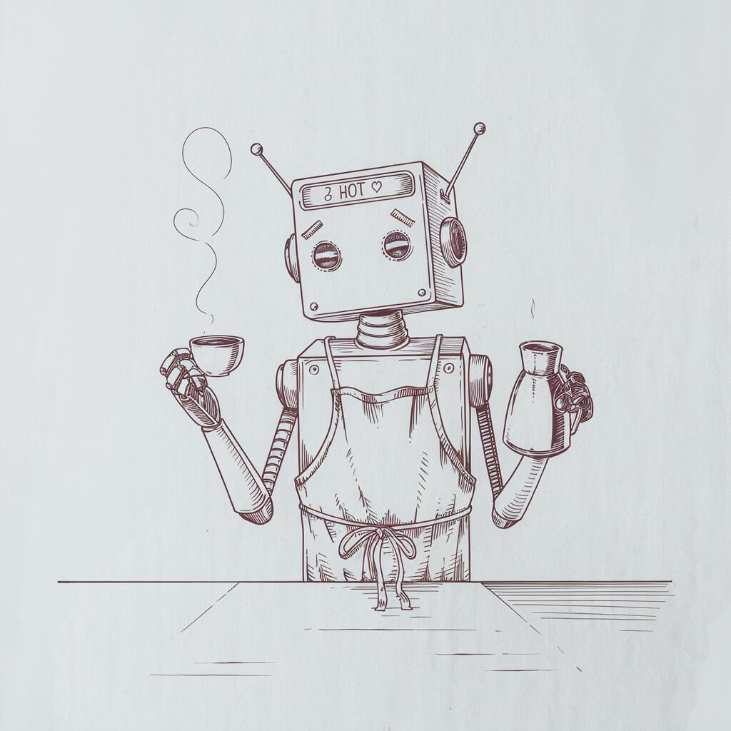 A minimalist, plain white background pencil drawing illustration of a coffee barista robot. The robot stands behind a sketched countertop, holding a tiny steaming cup in one metallic hand and a milk frother in the other. A small apron is tied around its boxy torso with loose loops and folds. The robot's head features a display that reads "HOT ☕" and two raised antennae angled like eyebrows. A few floating steam lines curl gently upward. The drawing's light details create a cozy, café-like mood while remaining clean and uncluttered.
