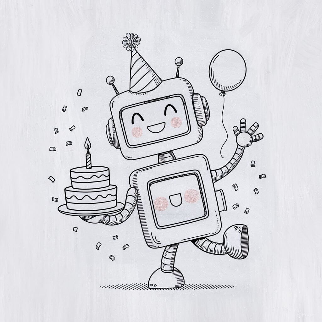 A minimalist, plain white background pencil drawing illustration of a birthday party robot, drawn in a simplistic style. The robot wears a cone-shaped party hat and holds a small, two-layer cake with a flickering candle. Confetti pieces are gently sketched around its feet, and a tiny balloon is tied to one antenna. Its digital screen shows a big smiling face with blush dots. The robot’s arms are outstretched in celebration, and one foot is lifted mid-dance. Clean, rounded edges and festive details make the scene joyful while keeping the visual style minimal and charming.