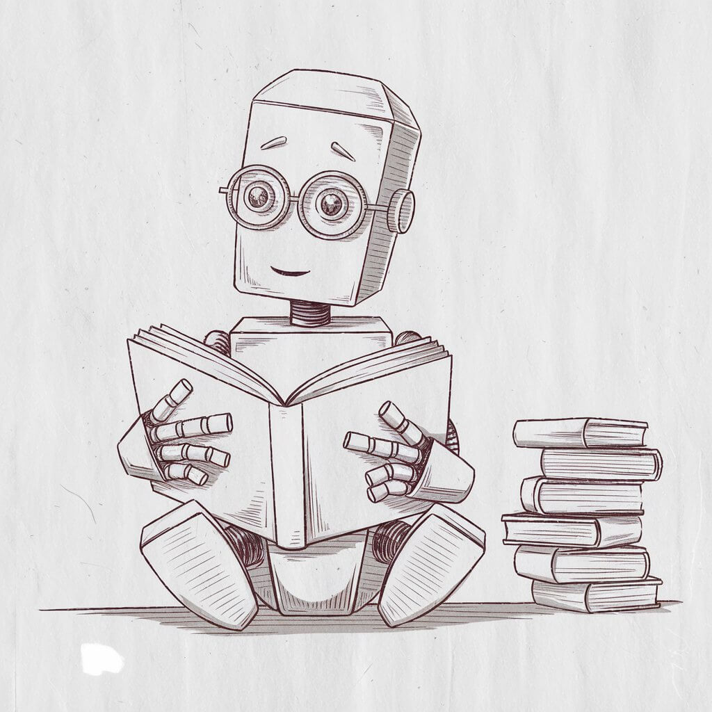 A minimalist, plain white background pencil drawing illustration of a bookworm robot. The robot sits cross-legged on the floor, holding an open book with rigid, rectangular fingers. Its round glasses are drawn with thin lines over two wide, focused eyes. A small stack of books is beside it, each represented with simple rectangular outlines and faint horizontal lines for pages. The robot’s head is tilted slightly, conveying quiet engagement. The clean sketching style emphasizes the calm mood and intellectual curiosity of this charming, scholarly machine.