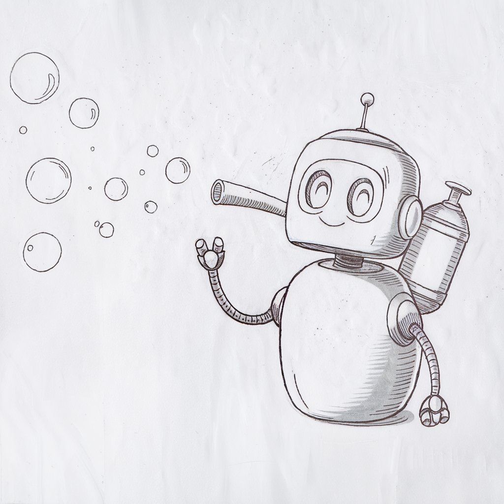 A minimalist, plain white background pencil drawing illustration of a bubble-blowing robot, drawn in a simplistic style. The robot has a rounded, compact body with a tube-like arm extended forward, releasing lightly sketched bubbles. Each bubble is a delicate circle with minimal shading to show transparency. The robot's face displays two large, oval eyes with a soft, joyful curve. A canister on its back is detailed with faint lines to resemble a soap container. The simplicity of the design, with smooth contours and evenly spaced limbs, gives the character a cheerful, childlike presence amid the stark white background.