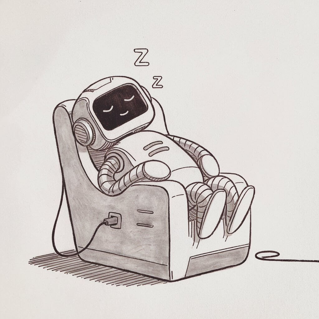 A pencil drawing illustration of a sleepy charging robot on a plain white background. The robot is slumped in a chair-like dock with a plug inserted into its side. There are two small "Z" symbols floating above its head. The robot's digital face is a blank screen with only a dim smile. The light lines create a cozy, motionless atmosphere. The design is kept clean with basic shapes and a calm posture that evokes restfulness.