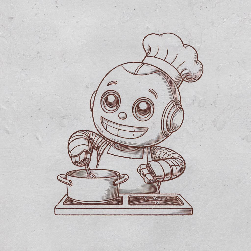 A minimalist, plain white background pencil drawing illustration of a kawaii robot chef. The robot is shown mid-cooking, with its hands moving to stir a pot on a stove. The robot has a round head with big eyes, a small nose, and a wide smile. The robot is wearing a chef's hat and a checkered shirt.
