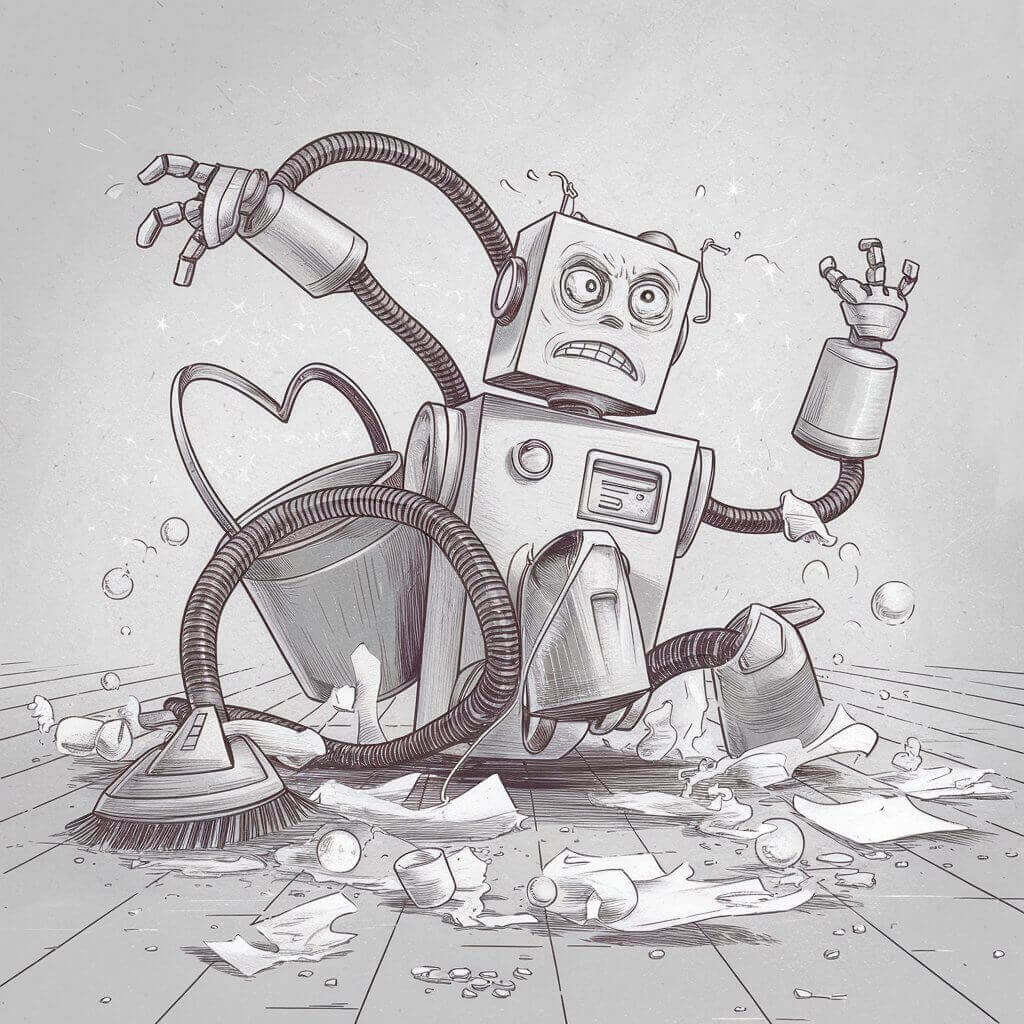 A minimalist, plain white background pencil drawing illustration of a robot caught in a cleaning frenzy. The robot is depicted mid-spill with a vacuum nozzle tangled around one leg and a bucket tipping over behind it. Its digital face shows panic—wide, shocked eyes and a crooked frown. Soap bubbles and paper scraps scatter the floor, all lightly sketched for texture without overcrowding the image. The limbs are angled in frantic motion, making the scene comically chaotic yet charmingly clear.