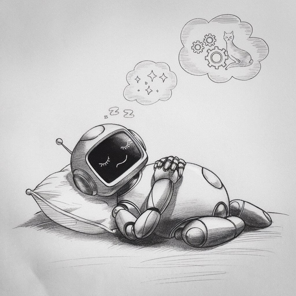 A pencil drawing of a robot in sleep mode on a plain white background. The robot is curled up like a child, with its limbs relaxed and its screen face dimmed with a faint smile. Above its head, light thought bubbles show dream imagery—stars, gears, and a flying cat. The shading is kept soft, evoking nighttime calm. The robot's body is composed of smooth, rounded parts and rests on a gently sketched pillow. The whole scene is hushed and tender, conveying emotion and imagination through simplicity.