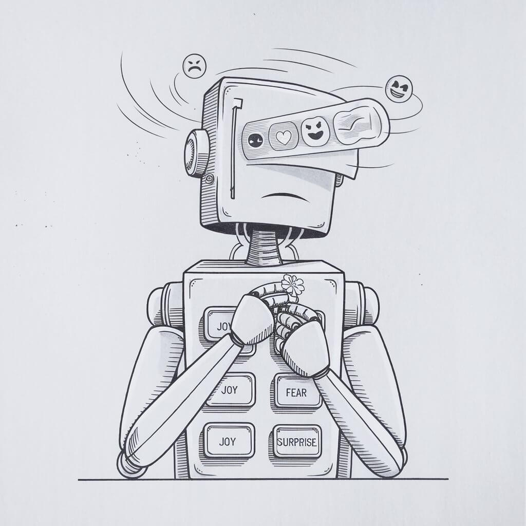 A minimalist, plain white background pencil drawing illustration of an emotion-testing robot. The robot's face is a rotating screen, shown in mid-spin between a frown, a heart, and a laughing emoji. Its torso displays buttons labeled with different emotions like "Joy," "Fear," and "Surprise," each rendered in clear pencil lettering. One arm holds a flower while the other is placed over its chest as if pondering. Light motion lines surround its head to show inner conflict. The design is clean and conceptually rich, using minimal lines to express deep feeling.