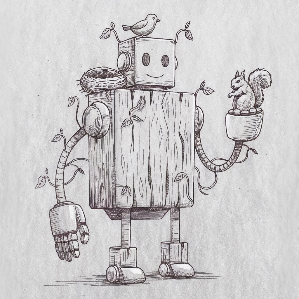 A pencil drawing of a forest guardian robot, drawn in a creative style. The robot has wooden panel textures sketched onto its rectangular frame, with leafy vines loosely curling around its arms and legs. A bird nest rests atop its shoulder, while one open palm gently supports a squirrel. Its face is softly shaped, featuring two large, kind eyes. Simple hatching creates a bark-like texture, and the robot’s stance is calm and protective, emphasizing a harmonious connection with nature through minimal, deliberate lines.