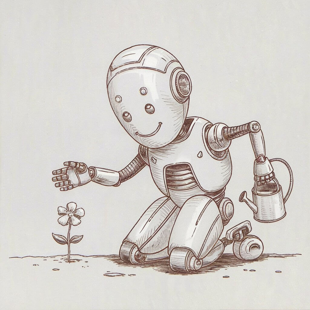 A pencil drawing illustration of a gardening robot on a plain white background. The robot is kneeling beside a small sprouting flower. It has a smiling face with two dot eyes and a curved mouth. The robot's mechanical hand gently extends towards the plant. A tiny watering can is attached to its arm via a short hose. There are dirt marks around the robot's knees. The flower has simple petals and a single leaf. The robot's posture and expression convey kindness and quiet care.