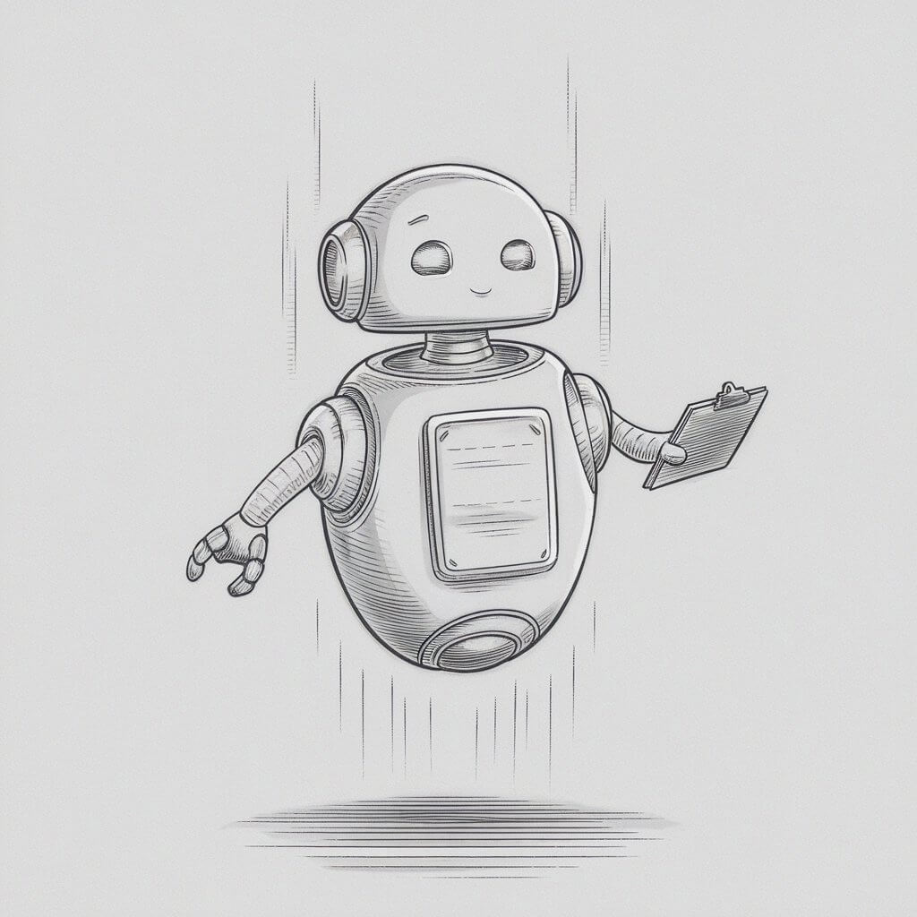 A pencil drawing of a hovering robot with a minimalist style. The robot's oval body floats just above the ground, with subtle shadow lines beneath to imply height. Two small thrusters on either side emit faint, vertical motion lines, suggesting gentle lift. The robot's head is a dome with soft, glowing eyes and a neutral expression. A flat display panel on its chest is outlined with clean lines, and one hand is extended holding a clipboard. The composition is centered, with a light, weightless quality against the stark white space.