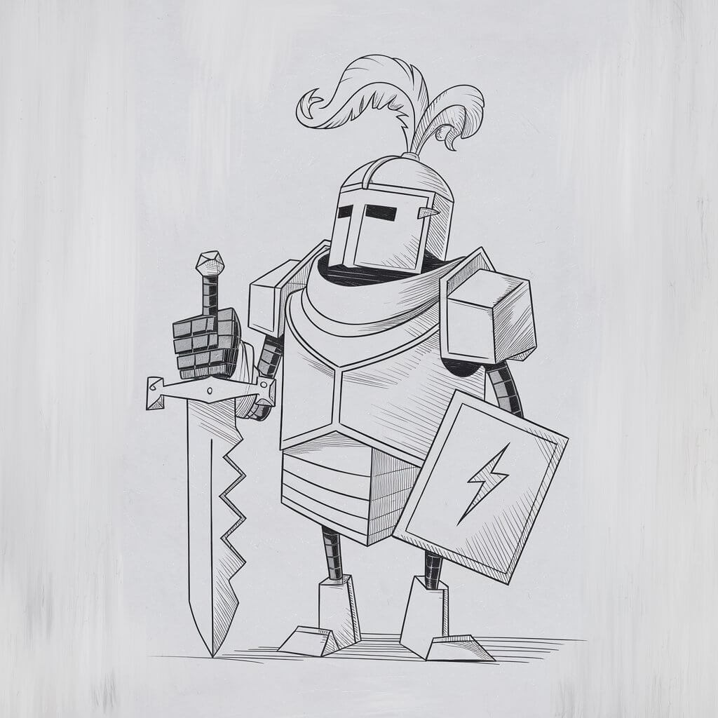 A minimalist, plain white background pencil drawing illustration of a medieval-inspired knight robot, drawn in a simplistic style. The robot wears a sketched, blocky breastplate and helmet, complete with a feather plume gently curling upward. One hand grips a pencil-rendered sword with a jagged edge, and a shield with a lightning bolt emblem is tucked under the other arm. Simple, cross-hatched shading hints at metallic texture without crowding the design. The robot stands tall and proud, with square feet slightly apart, exuding heroic confidence while maintaining clean, minimalistic lines.