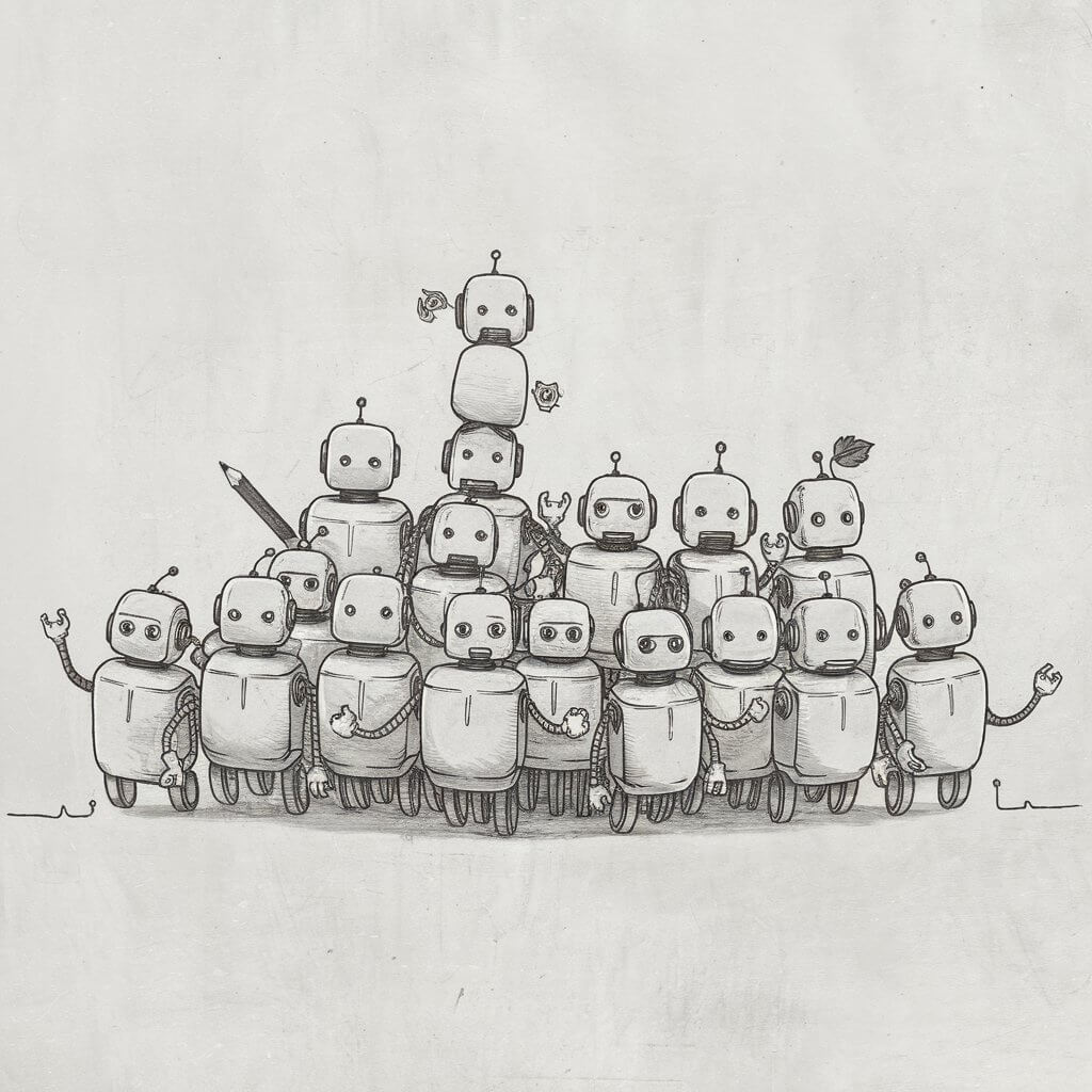 A minimalist, plain white background pencil drawing illustration of a swarm of tiny micro bots. Each robot is no larger than a fingertip, with small round heads and simple dot eyes. They move together in a loose formation, some stacked or piggybacking, others waving miniature arms. One carries a leaf, another rides a pencil, adding whimsy to their scale. Their features are crisp but not overly detailed, capturing individuality through variation in shape and motion. The entire swarm fits neatly within a clean, uncluttered layout.