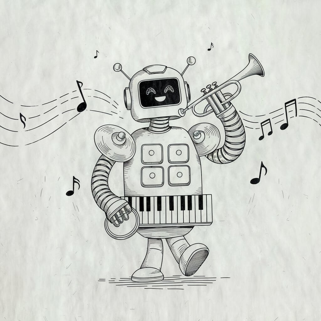 A minimalist, plain white background pencil drawing illustration of a music-making robot. The robot has drum pads embedded in its chest, cymbals for shoulders, and a keyboard as its lower torso. It holds a trumpet to its mouth with one hand while a foot taps a bass drum pedal. Pencil lines show a few musical notes floating in the air, adding rhythm to the scene. The robot's facial screen displays a cheerful expression.