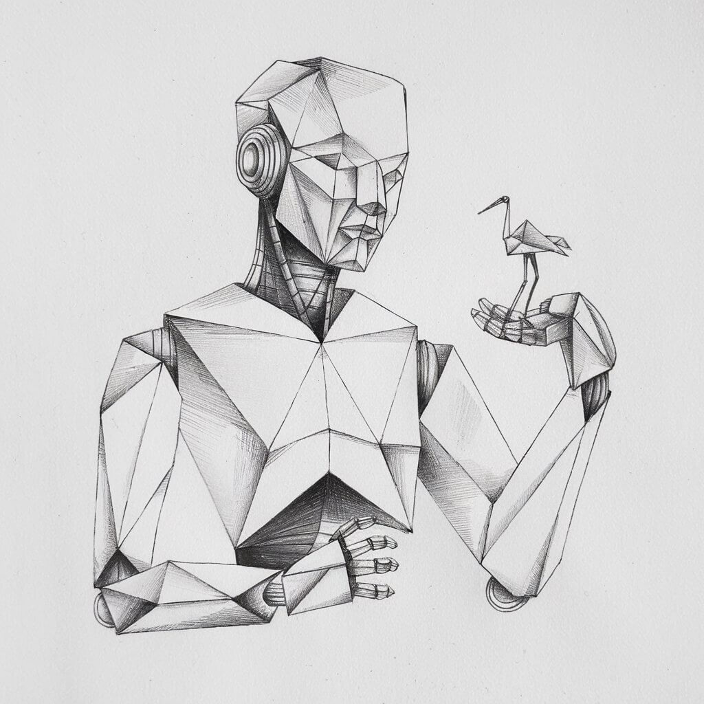 A minimalist, plain white background pencil drawing illustration of an origami-inspired robot. The robot's body is constructed from folded geometric panels, with visible crease lines that give it a paper-like aesthetic. Each joint resembles carefully bent corners, and its angular head tilts slightly to one side. The limbs are formed by overlapping triangles and diamond shapes. A delicate crane sits in its open palm, also rendered with fine pencil folds. The entire composition is crisp, clean, and cleverly abstract without losing the mechanical essence.
