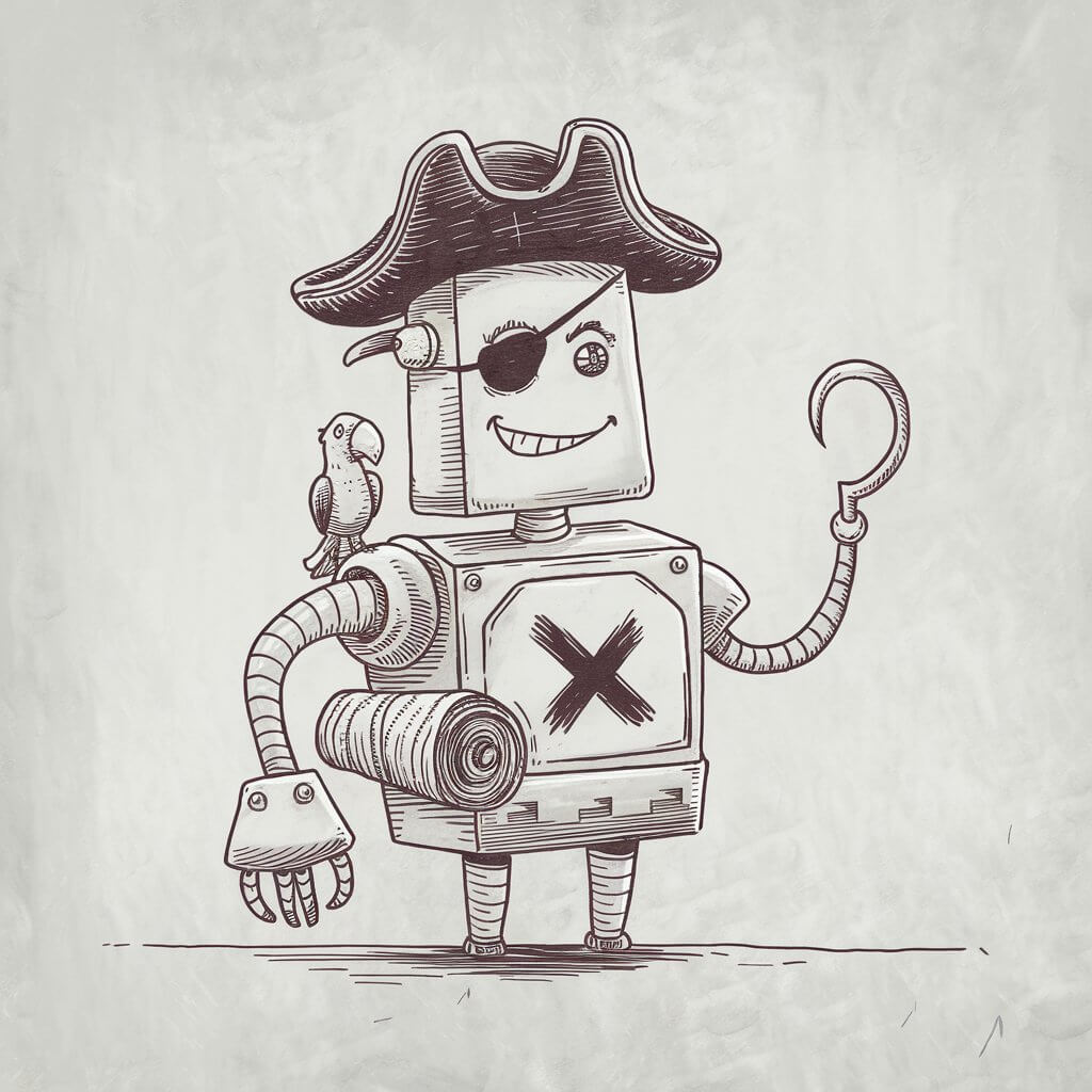 A minimalist, plain white background pencil drawing illustration of a pirate robot. The robot is drawn in a simplistic style. It wears a sketchy tricorn hat, one eye is covered with an eyepatch, and it has a hook in place of one hand. The robot's metallic peg leg is lightly cross-hatched, and a tiny parrot-shaped drone sits on its shoulder. A treasure map is rolled under its other arm, and a big "X" is marked on its belly panel. The robot's grin is slightly mischievous, captured with a curving mouth line. Despite its adventurous spirit, the drawing stays crisp and uncluttered.