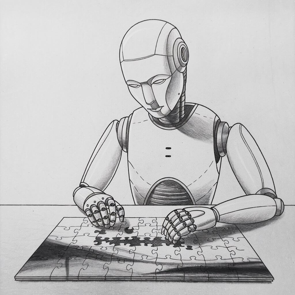A minimalist pencil drawing of a robot with a plain white background. The robot is sitting at a table and is solving a jigsaw puzzle. The puzzle has an abstract image of a landscape. The robot has a simplistic style, with a tilted head and furrowed brow. The clean lines of the drawing reflect the robot's quiet determination and calm activity.