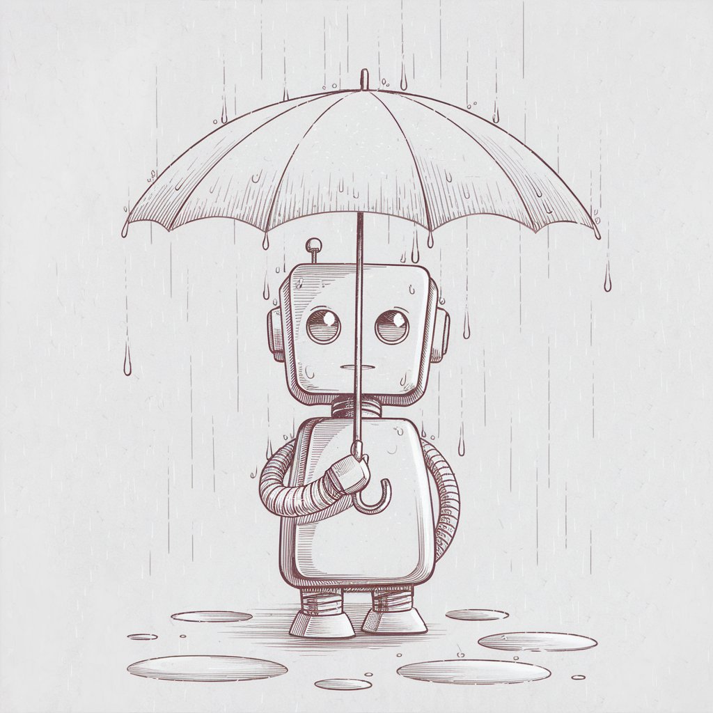 A minimalist, plain white background pencil drawing illustration of a rain-drenched robot. The robot holds a droopy umbrella with slightly bent spokes, shielding its square head from gently falling raindrops. Water droplets are lightly sketched over its shoulders and arms, with puddles pooling around its flat, circular feet. Its face features a neutral expression with two large eyes reflecting tiny rain specks. The umbrella and robot are framed with soft pencil lines that capture the tranquil, moody atmosphere while preserving the minimalist aesthetic.