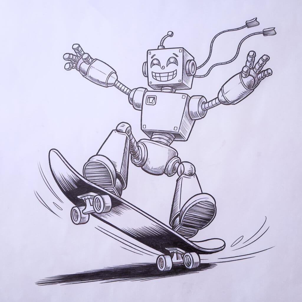 A pencil drawing of a robot riding a skateboard on a plain white background. The robot is mid-trick, with its arms flung out for balance and one foot kicking up the board's tail. The skateboard's wheels are lightly shaded circles, showing motion with small swoosh lines beneath. The robot's expression is thrilled—eyes wide and a pixelated grin on its screen face. Wires trail behind its back, fluttering like a scarf. The drawing is in a creative style and bursts with energy and youthfulness while retaining a streamlined form.