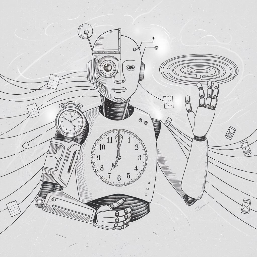 A minimalist, plain white background pencil drawing illustration of a time-traveling robot, drawn in a simplistic style. The robot's chest features a large, gear-lined clock face, and one hand holds a swirling, pencil-drawn portal disc. Its head includes a split design—half ancient helmet, half futuristic visor. One arm is adorned with a sundial, the other with a digital timer. Light lines around its body show fragments of swirling calendar pages and hourglasses. The contrast between eras is gently emphasized through detail without breaking the clean, minimalistic balance.