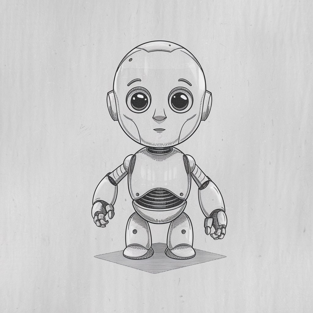 A minimalist, plain white background pencil drawing illustration of a toddler robot, drawn in a simplistic style. The robot is short and wide-eyed, with an oversized, rounded head and stubby limbs. It is standing on a gray square base.