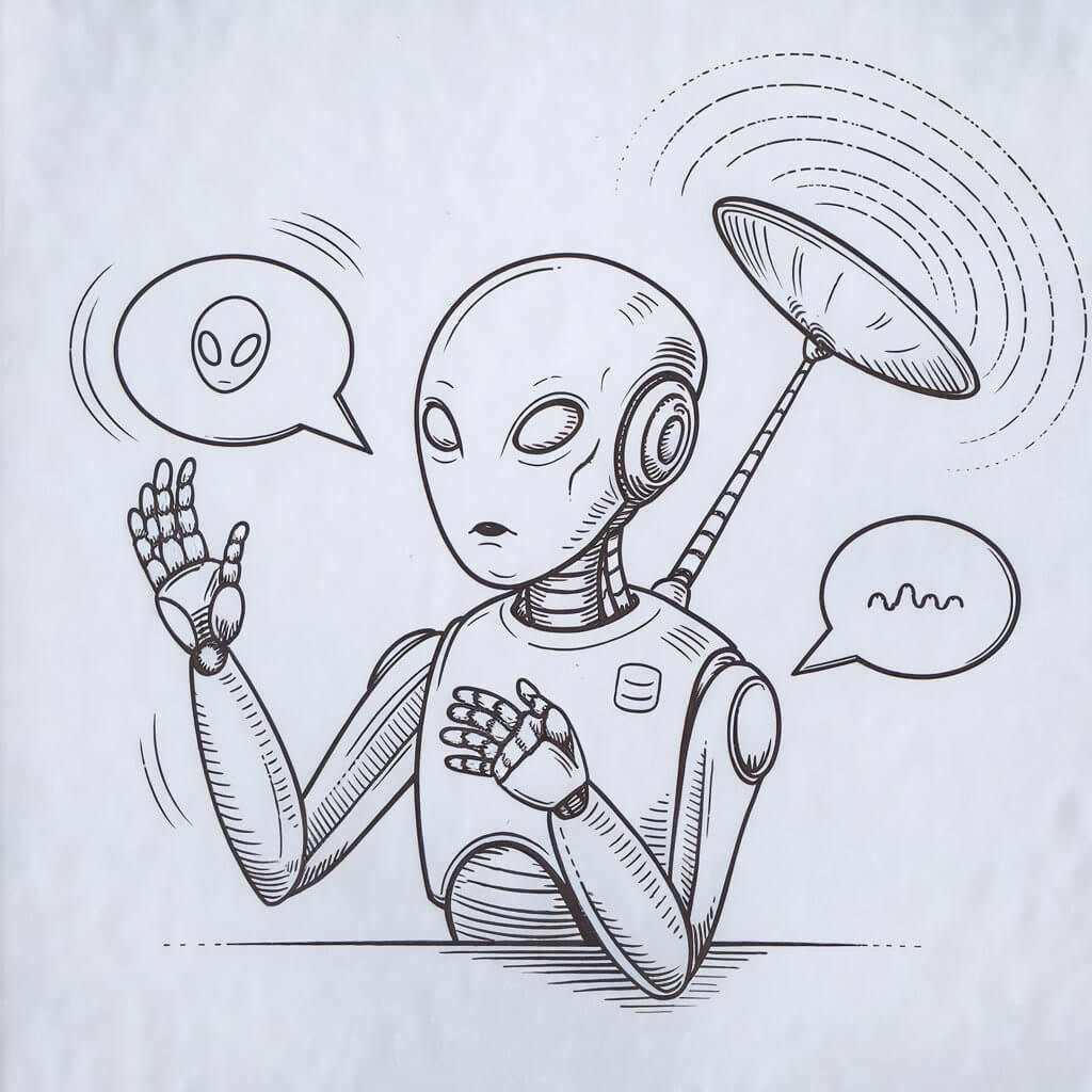 A minimalist, plain white background pencil drawing illustration of an alien translator robot, drawn in a simplistic style. The robot holds a speech bubble in one hand containing a strange alien symbol, and another bubble beside it shows the translated human word. A dish-shaped antenna extends from its back, lightly sketched with circular wave lines. The robot's head is smooth and oval with blinking dot eyes and a waveform mouth. Its arms are slightly raised, indicating active listening. The scene is futuristic but minimal, relying on clean design and symbolic clarity.