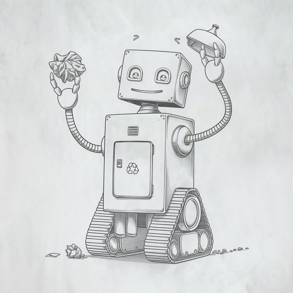 A minimalist, plain white background pencil drawing illustration of a trash-collecting robot, drawn in a simplistic style. The robot's square body includes a compartment door labeled with a small recycling symbol. One arm is extended with a claw holding a crumpled can, while the other lifts a lid. Its legs are simple tracks, lightly shaded to imply movement. The face features a single straight-line mouth and two rectangular eyes with subtle upward curves to suggest satisfaction. A tiny trail of collected debris lies near its feet. The robot's pose and expression reflect efficiency with a touch of personality.