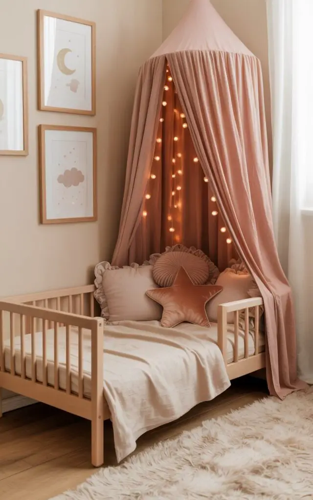 A fabric canopy draped over the bed creates a magical and cozy sleeping environment.