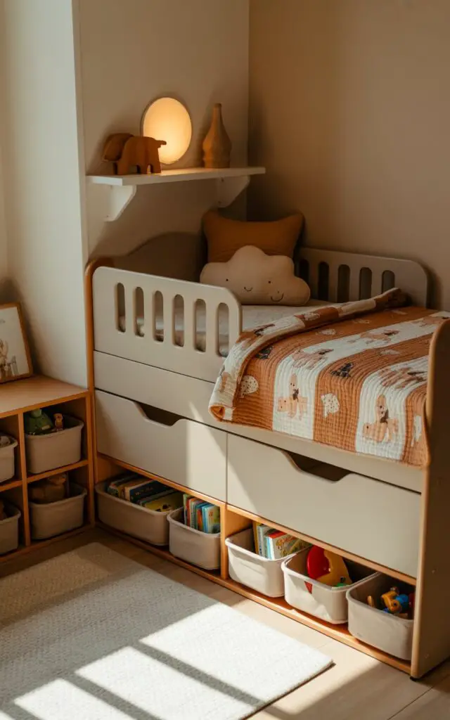 Under-the-bed storage is a lifesaver in small toddler bedrooms.