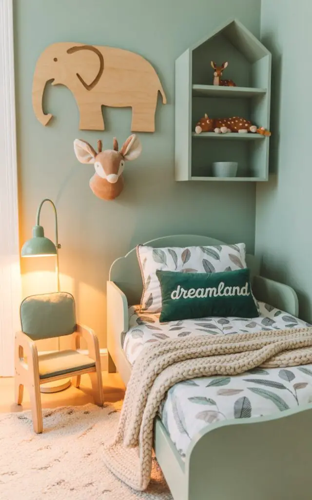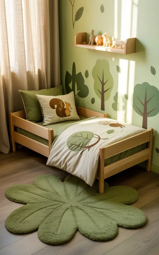 Leaf-shaped rugs, animal-shaped wall hooks, or tree-inspired murals can create a playful yet soothing environment.