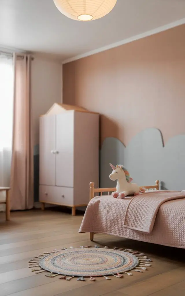 A soft, durable rug serves multiple purposes in a toddler’s bedroom.