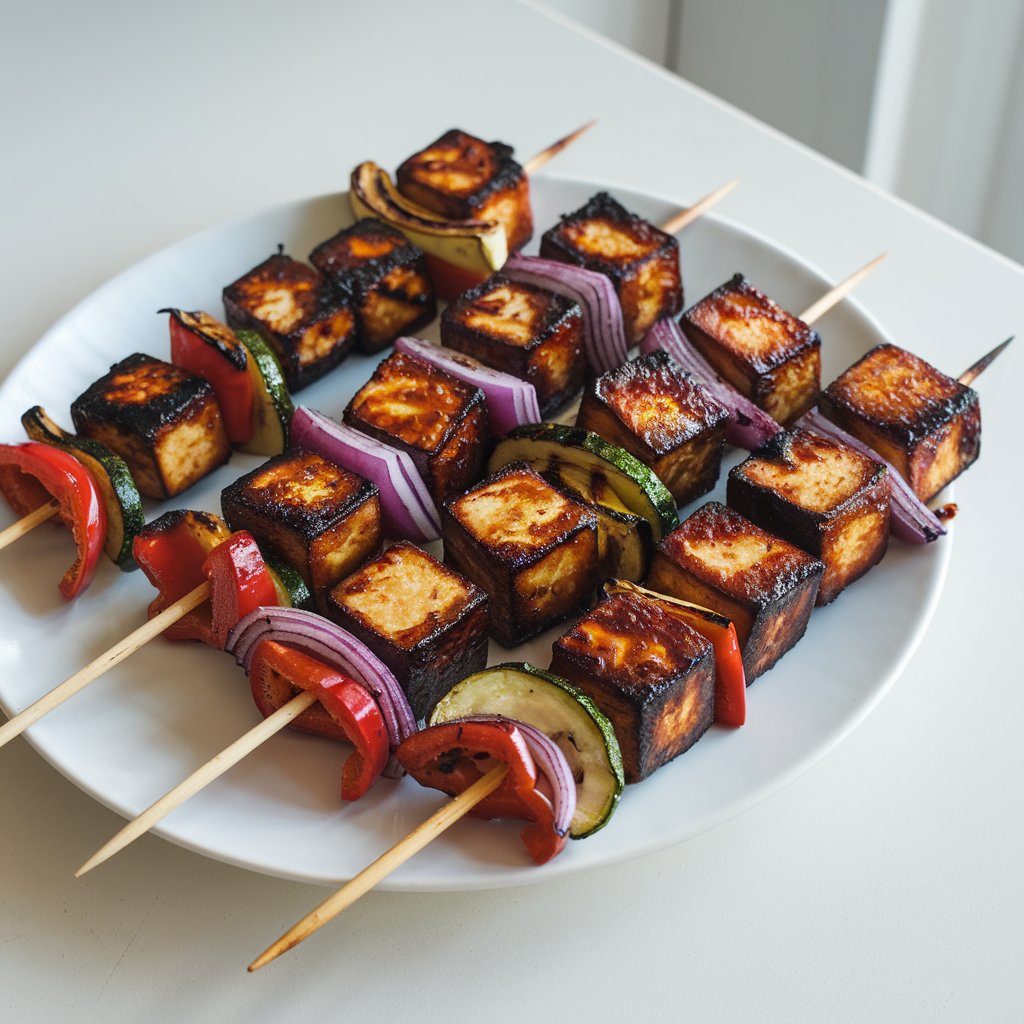 Marinate tofu cubes in BBQ sauce, then skewer with vegetables and grill until charred.