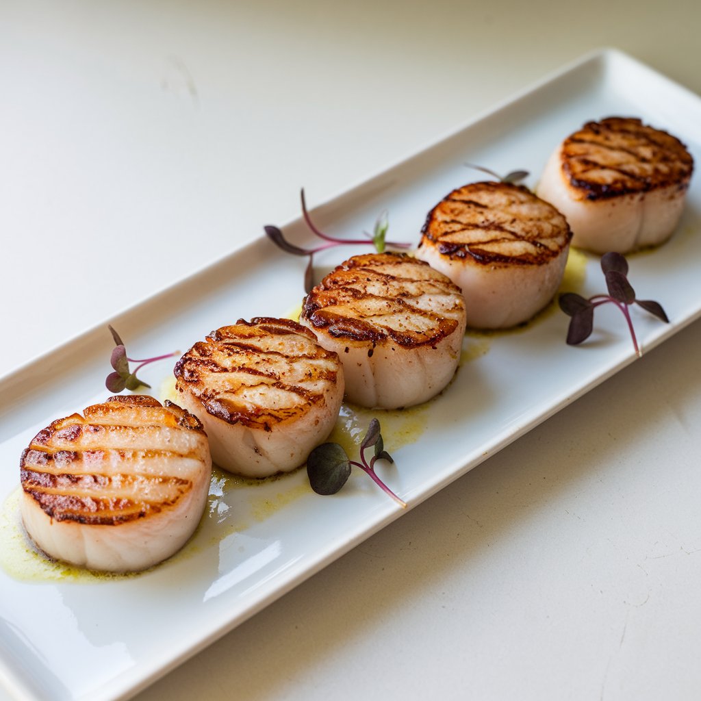 Marinate scallops in garlic and lemon juice, then grill until just cooked through.