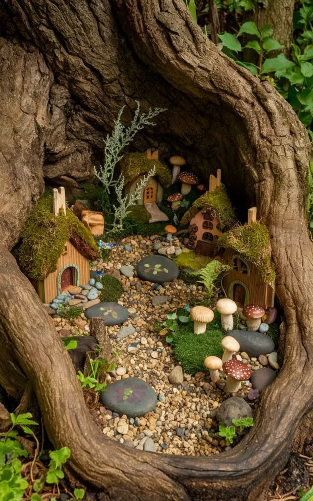 Create a tiny village beneath a tree or nestled in moss using miniature furniture, houses, or even acorn caps.