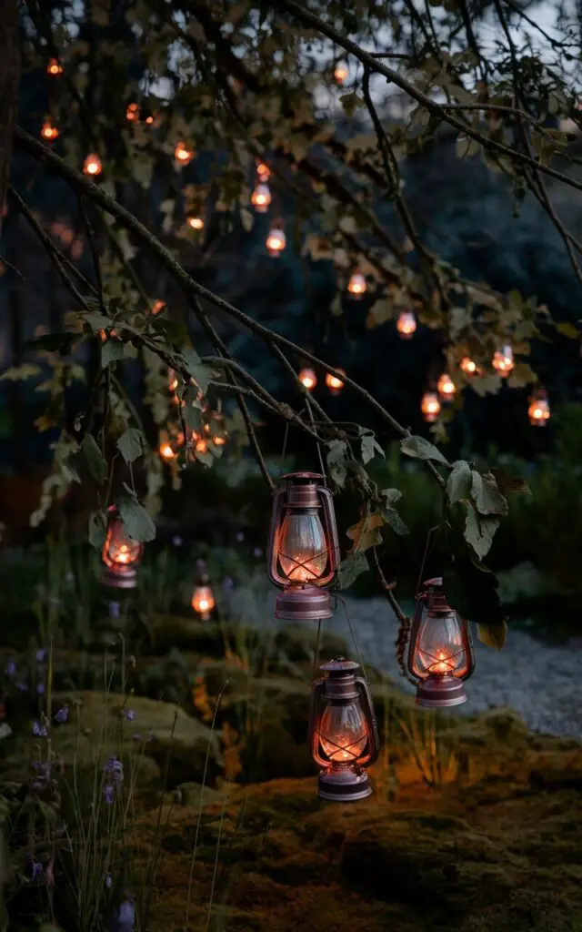 Drape soft, glowing lanterns from low-hanging branches to make your woodland garden feel like a nighttime fairytale.